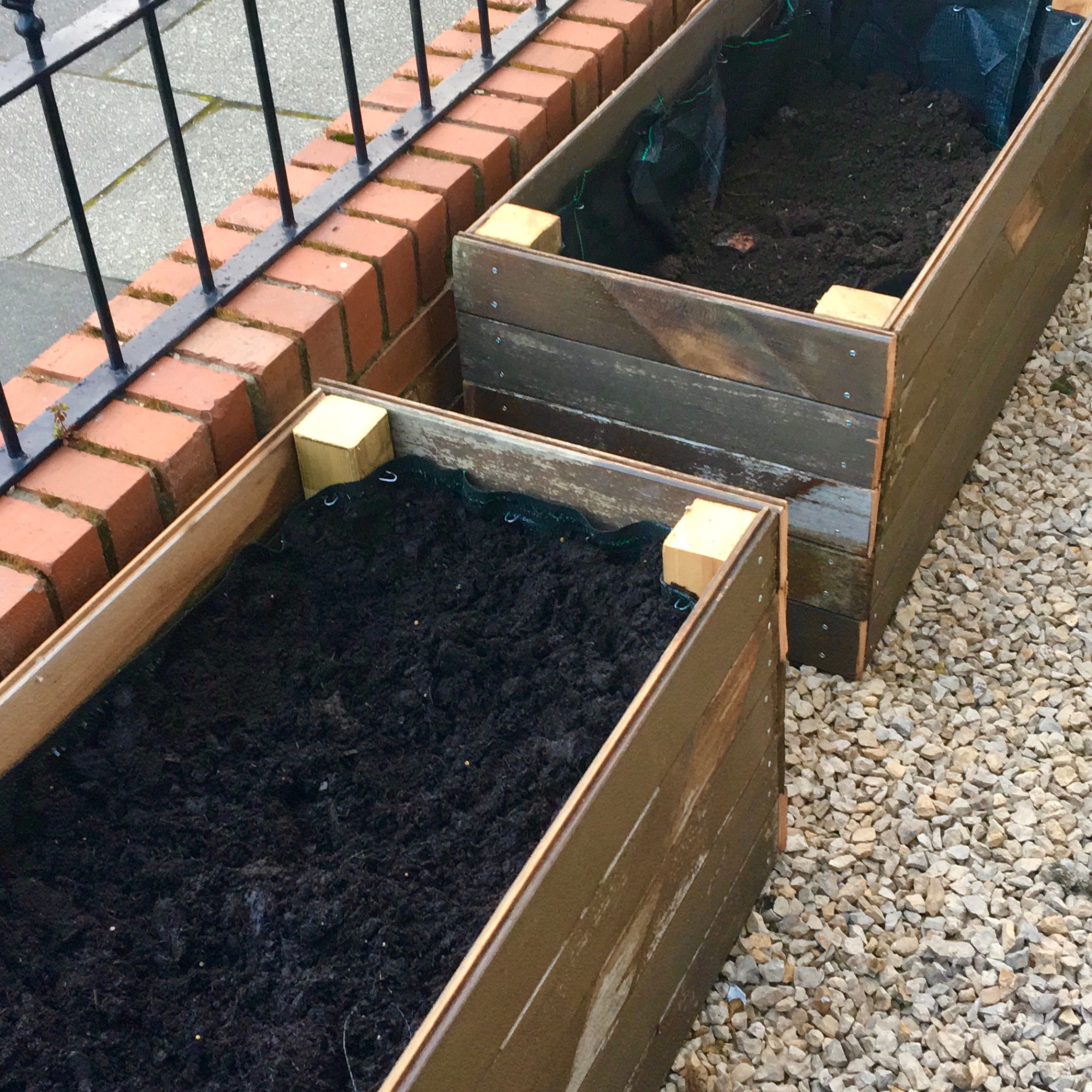 I took to Facebook marketplace again (the place of dreams), and found a few people giving away free top soil. We loaded up a few old compost bags full and dumped that in the beds. Once approximately 1/3-1/2 full of top soil, we filled the rest with a mixture of bought peat-free compost and some composted horse manure (kindly donated by my parents to the cause). I gave it all a good mix up and then waited impatiently for spring to arrive!