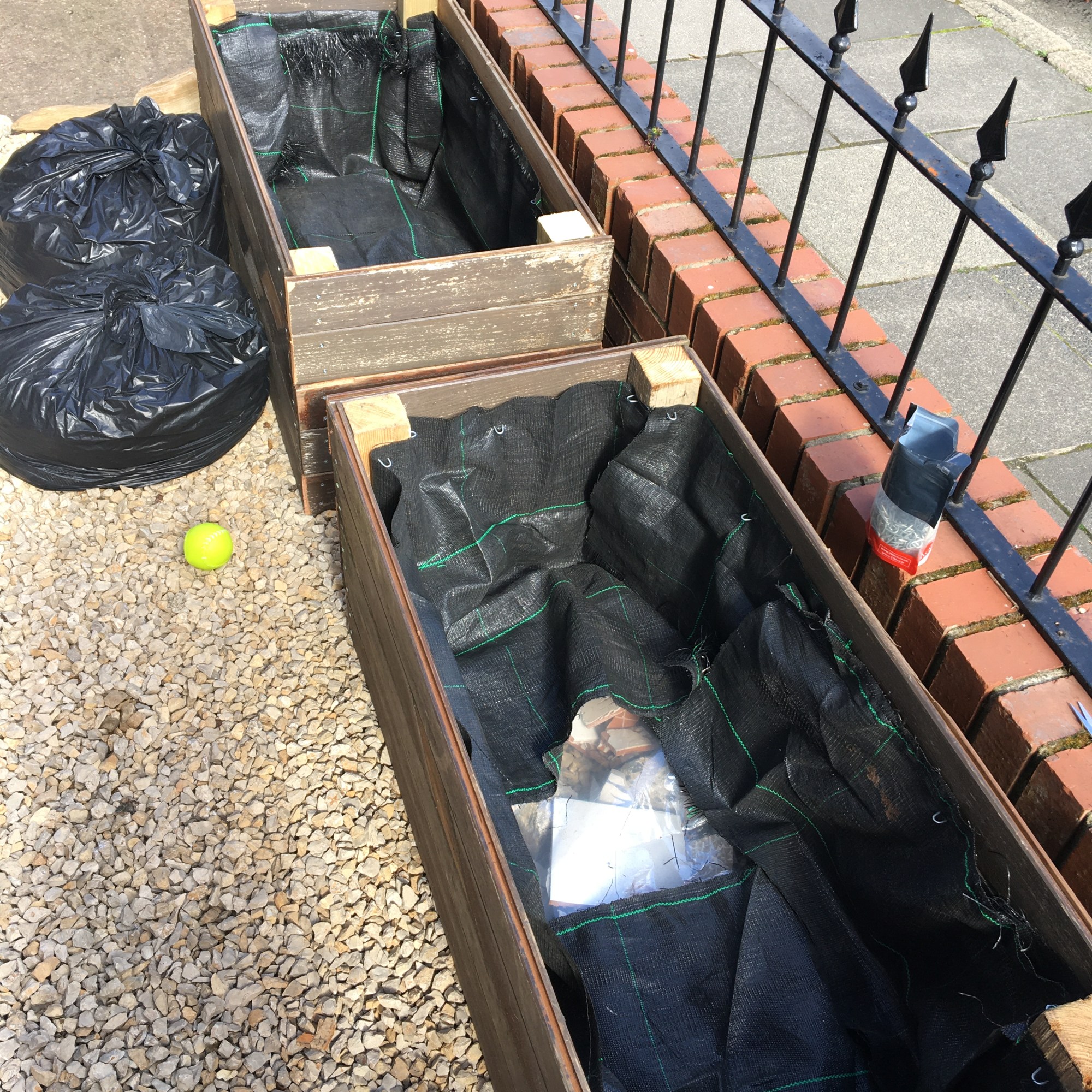 Once the beds were up and assembled, although standing on gravel already, I threw in some old rocks and broken crockery to allow for better drainage at the bottom. Once in, I lined them both with a weed membrane and stapled it in place.