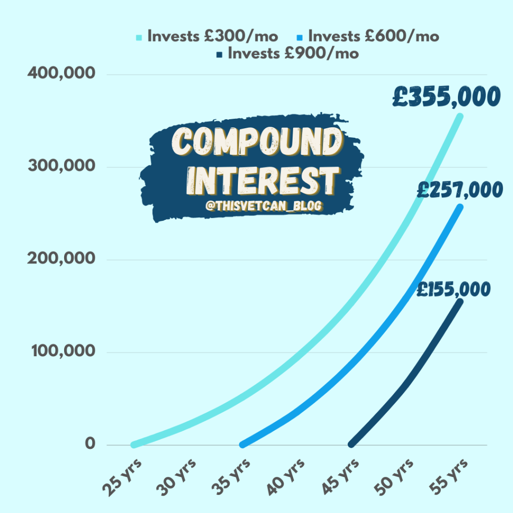 And why should you start? Because the sooner you invest money, the longer it has to grow. And thanks to compound interest, if you start investing even a small amount early on (often only £50 minimum per month!), the money has time to snowball and snowball compared to if you start investing much more later on! See my handy graph below to illustrate this better than I can write it: